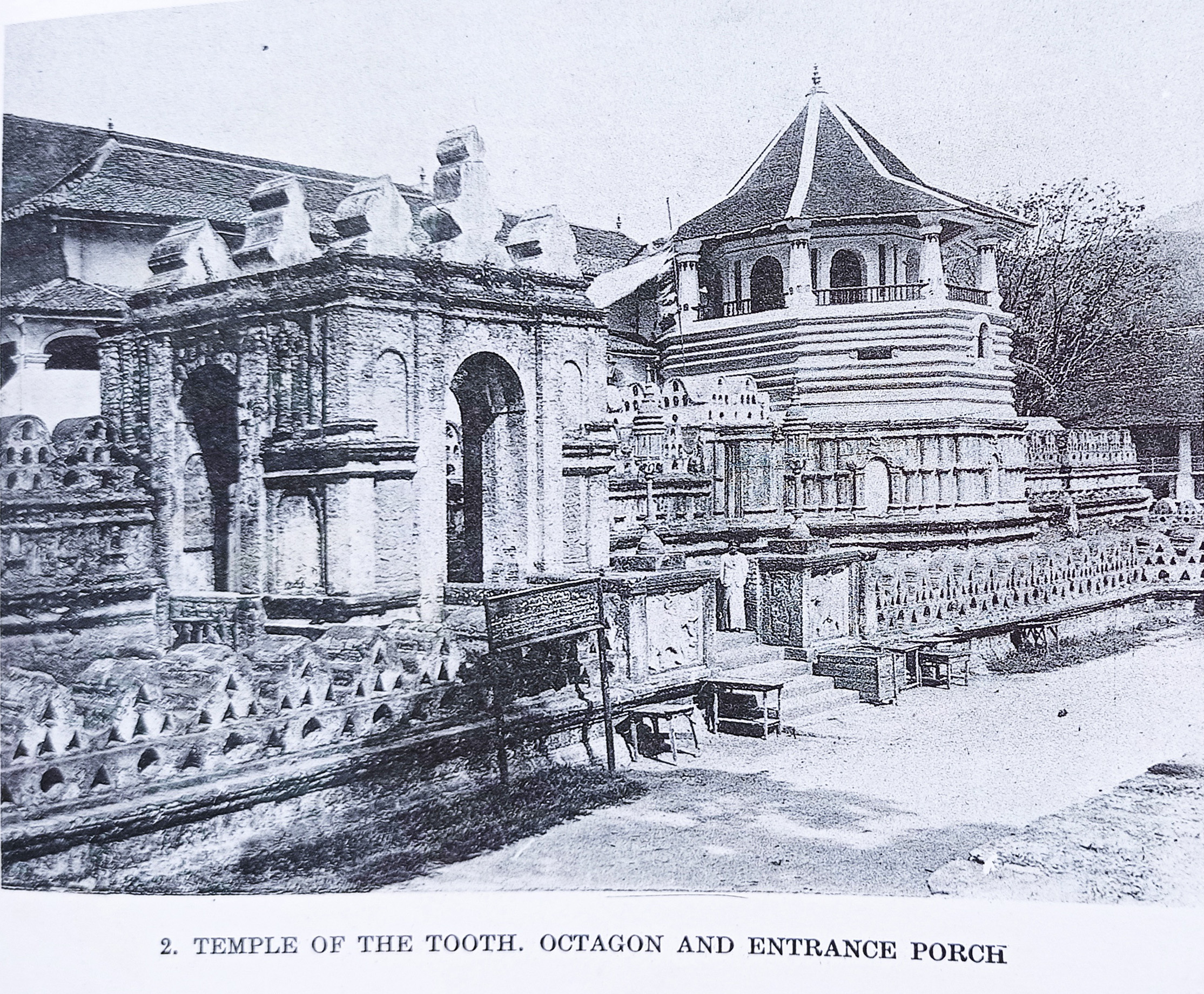 L’entrée du Temple de la Dent, telle que représentée dans une publication de l’archéologue anglais Arthur Maurice Hocart (1883–1939), parue au début des années 1930. L’escalier, composé de cinq marches — sans compter la plus petite, intégrée à la « pierre de lune » —, devait conserver cette configuration topographique jusqu’à l’attentat terroriste de 1998 | Image courtesy : Suriyakantha Centre for Art & Culture®