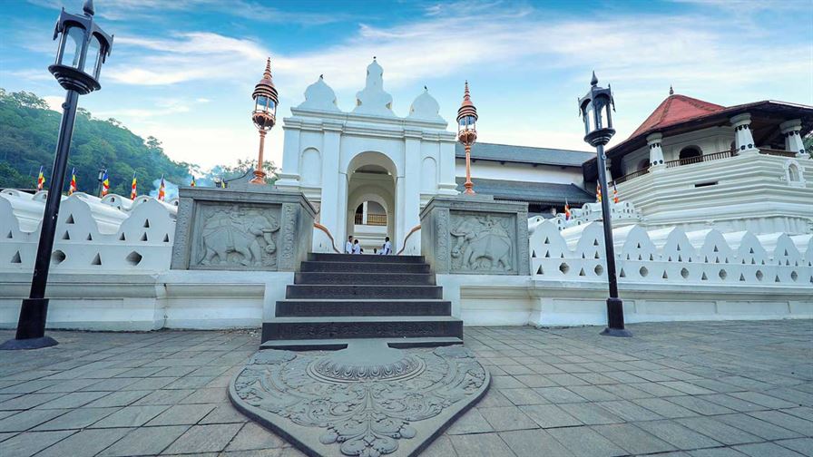 Entrée actuelle du Temple de la Dent, reconstruite après l’attentat terroriste de 1998. Elle comporte bien les six marches « d’origine », visibles sur la photographie ancienne de Scowen, précédées de la traditionnelle « pierre de lune ». © Sri Dalada Maligawa
