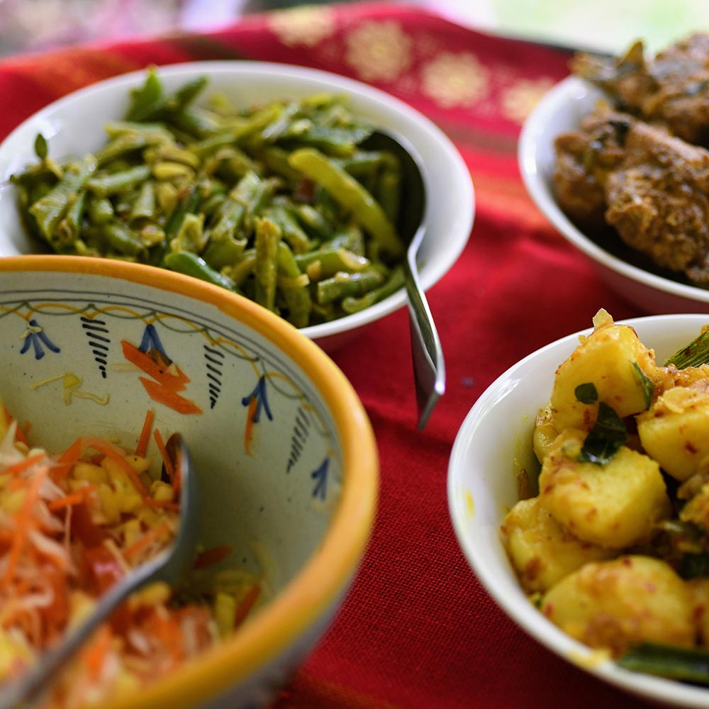 Trois currys de saison – un assortiment de trois currys de légumes, préparés avec des produits frais de saison et du dhal onctueux