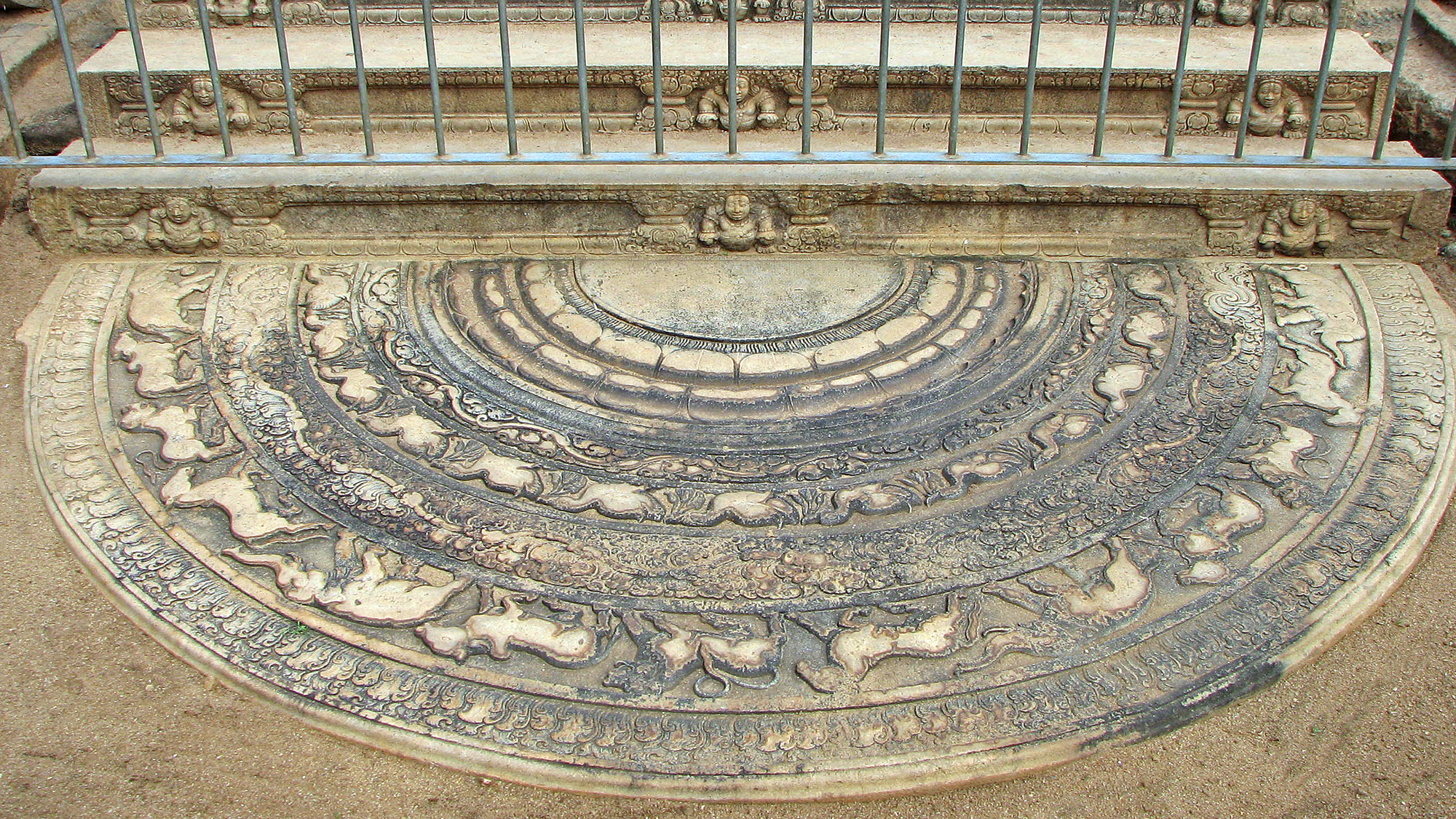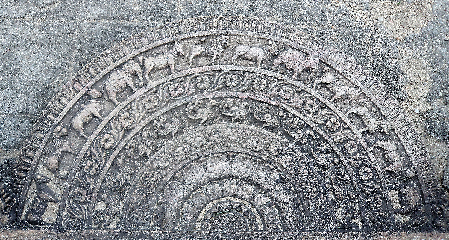 La dalle de pierre, dite « pierre de lune », n’est en vérité rien d’autre que la première marche du seuil conduisant aux édifices religieux. A l’origine, on peut supposer que la dalle est utilisée comme support à la base d’escaliers qui, étant en terre ou en bois, nécessitent un renforcement. C’est ainsi que des dalles rectangulaires remplissant cette fonction ont été fréquentes au début de l’ère d’Anuradhapura.