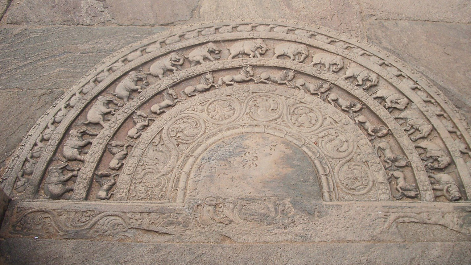 Une transition s’opère avec l’emploi de matériaux de plus grande longévité dans la construction d’édifices religieux, tels la brique ou la pierre. Débarrassée progressivement de son aspect utilitaire, elle devient une forme décorative à part entière avec sa propre spécificité topologique et un programme iconographique dédié, tous deux en constante évolution. Rectangulaire à ses débuts, ses angles furent adoucis pour en faire plus tard un demi-cercle rattaché à l’escalier. La primauté du cercle sur le rectangle pourrait s’expliquer par sa suprématie tant sur plan plan formel, présumé parfait que sur le plan symbolique (selon les civilisations, le cercle signifie tour à tour l’unité, la complétude, l’illumination, le cycle de vie et de renaissance, la roue de la vie…). Mais cette évolution pourrait aussi avoir un aspect plus prosaïque. Par rapport au rectangle, le demi cercle, sans aspérités, devait sans doute épargner les pieds nus des fidèles venus faire leur hommage dans ces sanctuaires — ce qui nous évoque, dans un autre domaine, le passage du caractère angulaire de l’écriture Brahmi aux courbes de l’écriture cinghalaise, ici pour ne point heurter la fragile feuille de palmier.